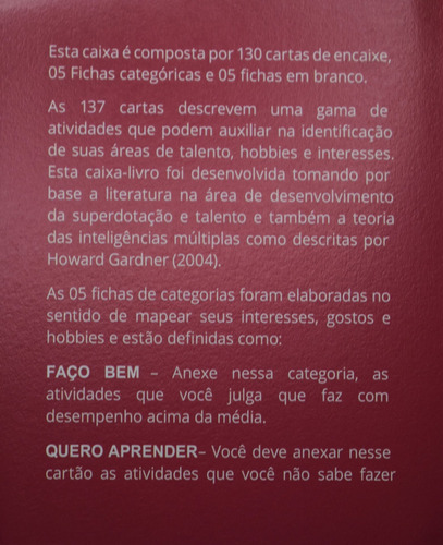 As 137 cartas descrevem uma gama de atividades que podem auxiliar na identificação de suas áreas de talento, hobbies e interesses. Esta caixa-livro foi desenvolvida tomando por base a literatura na área de desenvolvimento da superdotação e talento e também a teoria das inteligências múltiplas como descritas por Howard Gardner (2004).