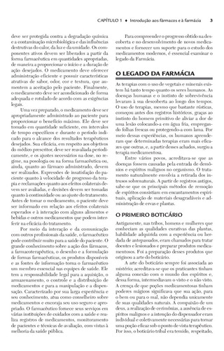 Totalmente atualizada, esta nova edição foi elaborada para proporcionar ao leitor o domínio de princípios, práticas e tecnologias essenciais para a preparação de formas farmacêuticas e sistemas de liberação de fármacos. O texto destaca-se pela abordagem integrada, que ajudará no entendimento das inter-relações entre princípios farmacêuticos e biofarmacêuticos, desenvolvimento de produtos, formulação, fabricação, manipulação e aplicação clínica das formas de dosagem para tratamento efetivo de pacientes. Novo! Objetivos do capítulo, que ajudam a orientar seus estudos, apresentando metas específicas de aprendizagem; Aplicando princípios e conceitos: no final de cada capítulo sugestões de atividades que permitem colocar em prática os novos conceitos; Conteúdo atualizado: contempla todas as formas de dosagem mais recentes no mercado, bem como as da U.S Pharmacopeia/National Formulary; Estudo de caso farmacotécnico e Estudo de caso clínico: oferecem ideias e soluções para os problemas que surgem na prática da farmácia; Apêndices, incluindo Definições de classes terapêuticas, Glossário de termos farmacêuticos e Sistemas e Técnicas de medida em farmácia.