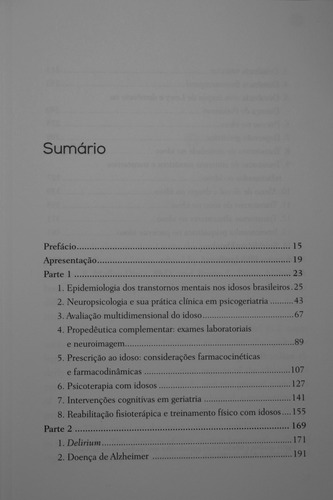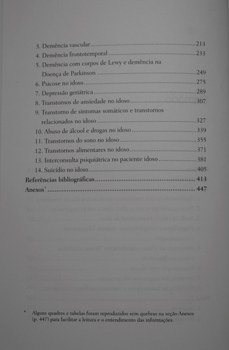Capítulos – Parte 1: 1. Epidemiologia dos transtornos mentais nos idosos brasileiros; 2. Neuropsicologia e sua prática clínica em psicogeriatria; 3. Avaliação multidimensional do idoso; 4. Propedêutica complementar: exames laboratoriais e neuroimagem; 5. Prescrição ao idoso: considerações farmacocinéticas e farmacodinâmicas; 6. Psicoterapia com idosos; 7. Intervenções cognitivas em geriatria; 8. Reabilitação fisioterápica e treinamento físico com idosos; Parte 2: 1. Delirium; 2. Doença de Alzheimer; 3. Demência vascular; 4. Demência frontotemporal; 5. Demência com corpos de Lewy e demência na Doença de Parkinson; 6. Psicose no idoso; 7. Depressão geriátrica; 8. Transtornos de ansiedade no idoso;m9. Transtorno de sintomas somáticos e transtornos relacionados no idoso; 10. Abuso de álcool e drogas no idoso; 11. Transtornos do sono no idoso; 12. Transtornos alimentares no idoso; 13. Interconsulta psiquiátrica no paciente idoso; 14. Suicídio no idoso.