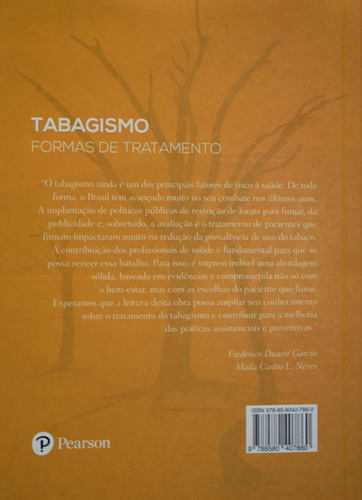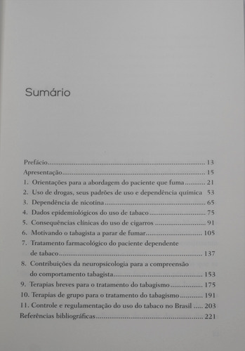 Capítulos: 1. Orientações para a abordagem do paciente que fuma; 2. Uso de drogas, seus padrões de uso e dependência química; 3. Dependência de nicotina; 4. Dados epidemiológicos do uso de tabaco; 5. Consequências clínicas do uso de cigarros; 6. Motivando o tabagista a parar de fumar; 7. Tratamento farmacológico do paciente dependente de tabaco; 8. Contribuições da neuropsicologia para a compreensão do comportamento tabagista; 9. Terapias breves para o tratamento do tabagismo; 10. Terapias de grupo para o tratamento do tabagismo; 11. Controle e regulamentação do uso do tabaco no Brasil