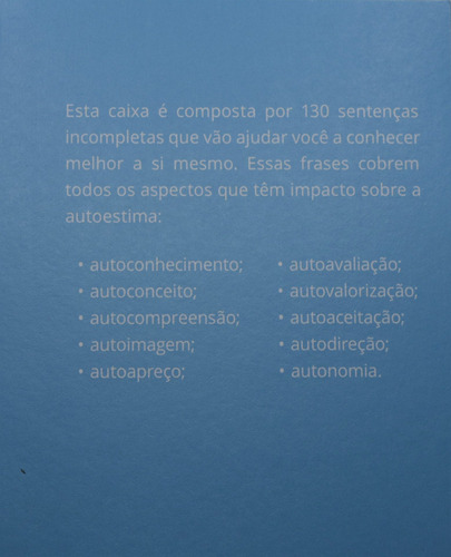 EEsta caixa é composta por 130 sentenças incompletas que vão ajudar você a conhecer melhor a si mesmo. Essas frases cobrem todos os aspectos que tem impacto sobre a autoestima: